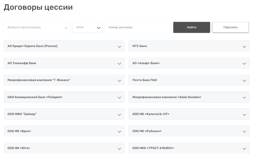 Многие коллекторские агентства на рынке «садятся» на заёмщиков одного крупного банка, но к «Первому клиентскому бюро» это не относится. Оно сотрудничает со многими кредитными организациями и МФО, а также другими юрлицами. На своём сайте компания размещает информацию о подписанных договорах цессии. Так, только за первый квартал 2024 года бюро заключило сделки по пакетному выкупу долгов с 14 кредиторами: