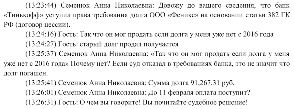 2. В том же 2021 году в Перми сотрудники «Феникса» пытались взыскать с гражданки долг перед банком, наличие которого она оспорила через суд 5 лет назад. Но это не помешало «Тинькоффу» в 2020 году продать несуществующую задолженность коллекторам, а тем – вводить женщину в заблуждение и требовать выплаты. Вот фрагмент электронной переписки между ними: